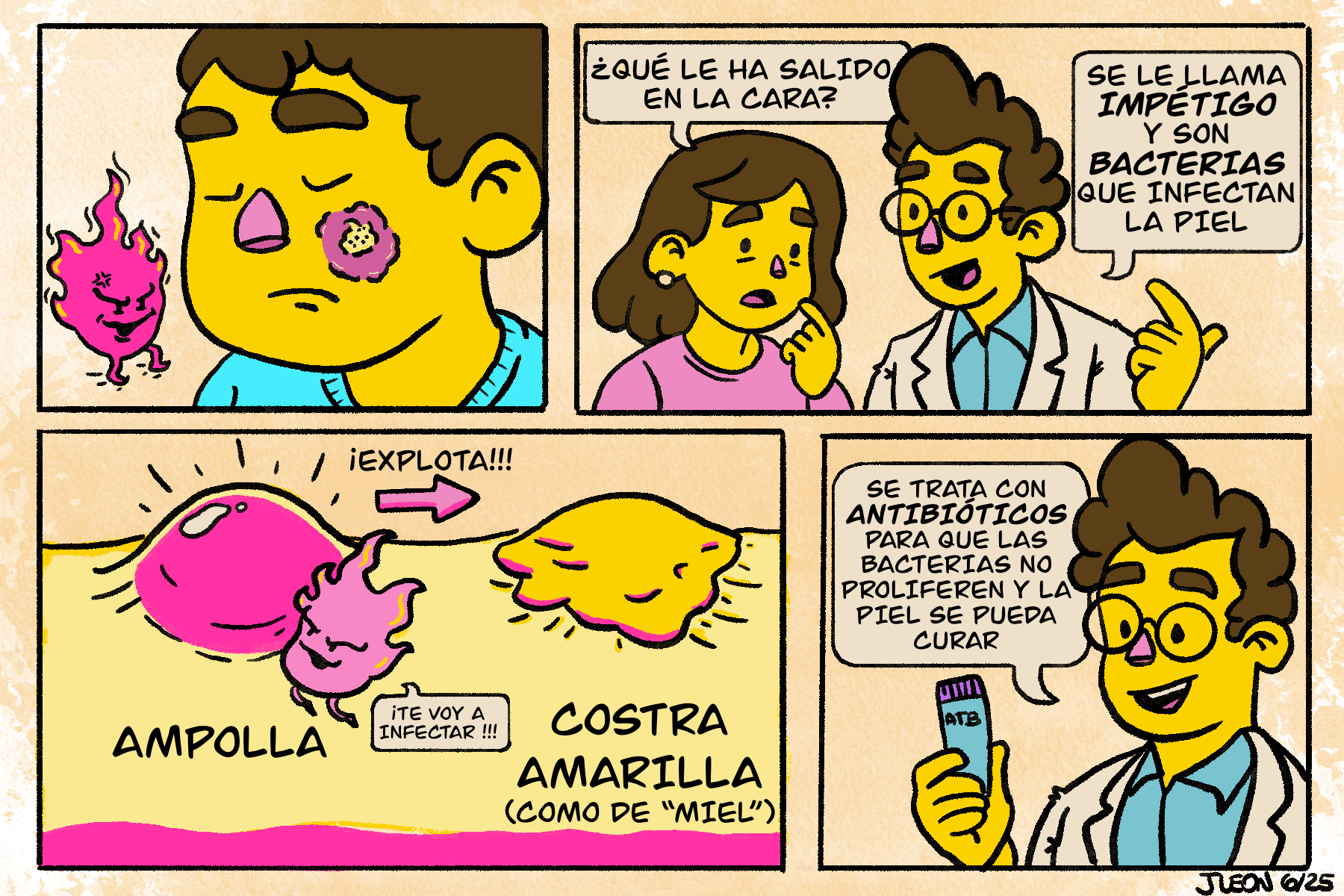 El impétigo es una infección superficial de la piel provocada por una bacteria. A diferencia de muchas lesiones víricas, el impétigo sí necesita tratamiento con antibióticos, y si no se trata, puede extenderse rápidamente a otras zonas del cuerpo o incluso a otros niños.